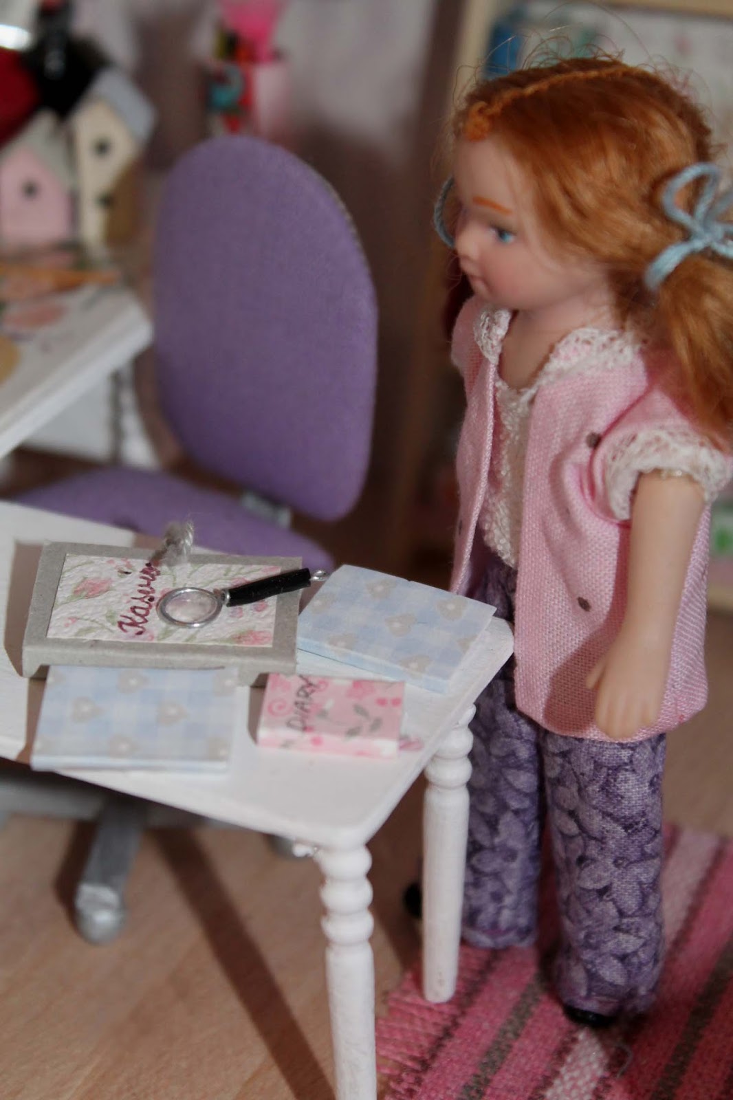Emilia on ottanut esille kesävierailta saamansa pienen päiväkirjan ja kaksi vihkoa. Pöydällä on myös mumman luona tehty kasvio ja suurennuslasi, jolla on kiva katsella kasvien yksityiskohtia.