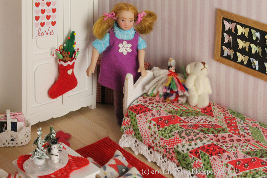 Emily has been busy in decorating her room. But after a couple of hours she is ready. She has a cute Christmas Stocking hangingfrom the knob of her wardrobe door. We don´t have same kind of traditions concerning Christmas Stockings, because Santa will visit every homes in Finland personally and brings us our gifts.